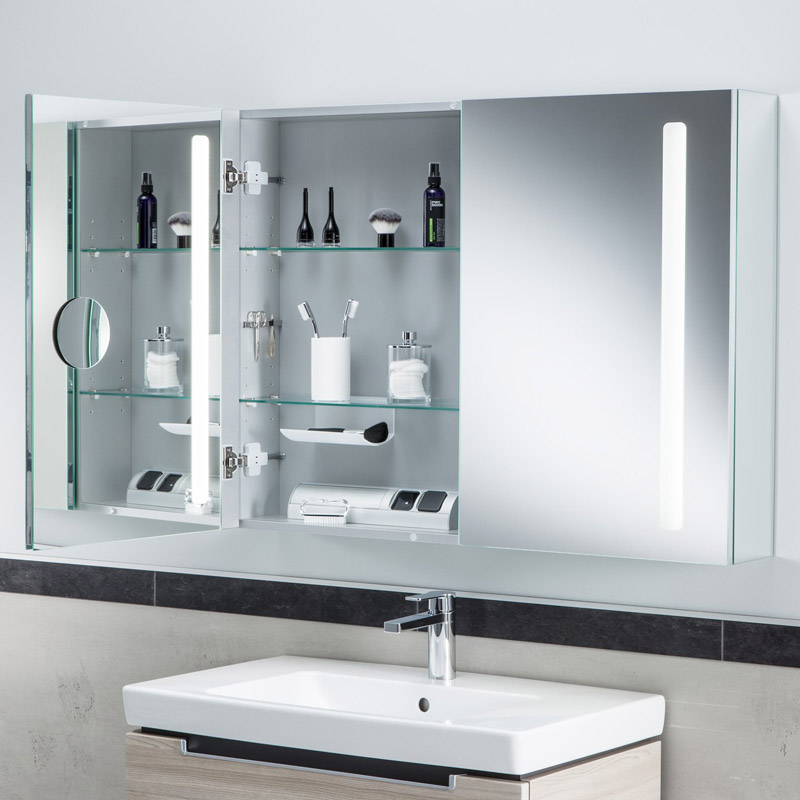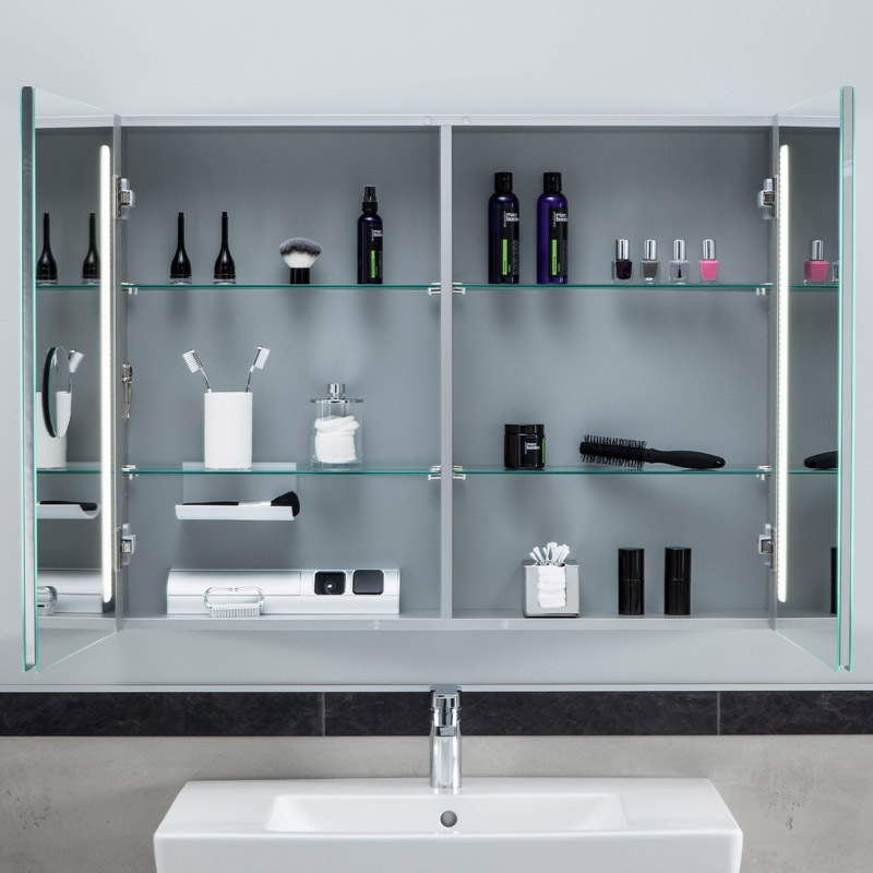Der My View 14 Spiegelschrank besticht durch seine klare Linienführung und das elegante Aluminiumgehäuse, das sich nahtlos in jedes Badezimmerambiente einfügt. Die zwei verspiegelten Türen bieten nicht nur eine großzügige Spiegelfläche, sondern auch einen einfachen Zugang zu Ihren Pflegeprodukten.