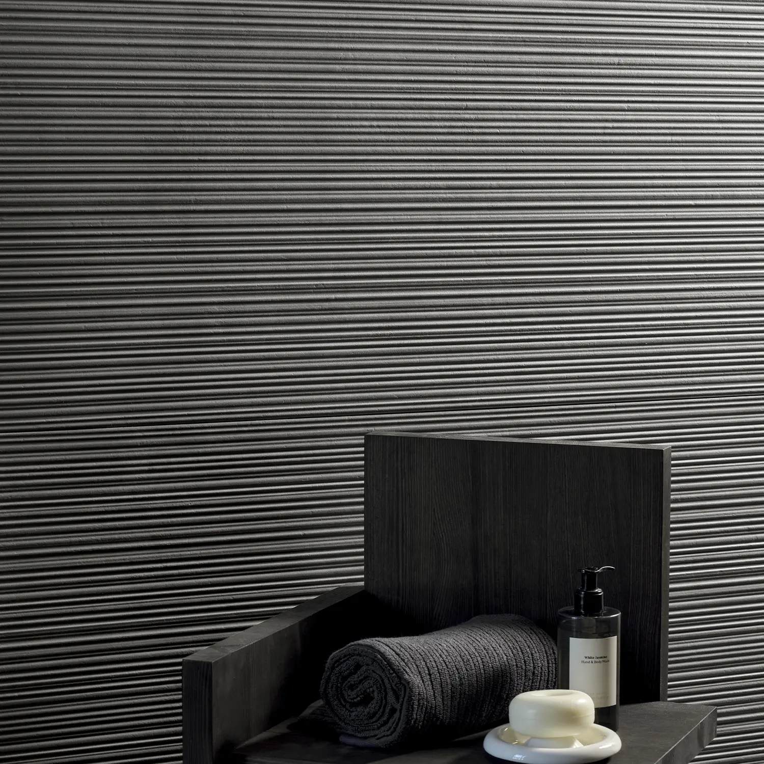 Als Dekor Rigato der Kollektion Infinita ist diese Wandfliese perfekt auf die dazugehörigen Grundfliesen abgestimmt und lässt sich vielseitig kombinieren – von Ton-in-Ton-Lösungen bis zu kontrastreichen Designs mit hellen oder warmen Farbtönen. Das längs verlaufende 3D-Linienrelief verleiht der Oberfläche eine moderne, grafische Struktur und sorgt je nach Lichteinfall für feine Schattenspiele. So entstehen optische Tiefe und eine besondere Dynamik, die der Wand Charakter und architektonische Wirkung verleihen.